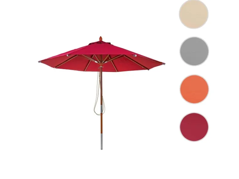 Sonnenschutz Deluxe! Mit den ersten wärmenden Sonnenstrahlen zieht es uns nach draußen. Egal ob auf der Terrasse oder im Garten – dieser Sonnenschirm wird garantiert zum Blickfang. Hier vereinen sich Design und UV-Schutz in perfekter Kombination. Der massive Holzmast und die mit Aluminium verstärkte Verstrebung tragen zu einem sicheren Stand bei. Durch das Winddach kann die Luft zirkulieren und der Schirm wird nicht zum gefährlichen Windfang. Auch bei einem leichten Regenschauer können Sie in Ruhe sitzen bleiben. Dafür sorgt der wasserabweisende Stoff aus gewebtem Polyester (Spun Poly). Dieser ist gegenüber einem normalen Polyester-Baumwollgemisch doppelt so langlebig, formstabil, atmungsaktiv, waschbar und muss nicht gebügelt werden. Das Mastende ist durch eine ca. 40 cm lange Aluminiumhülse ummantelt, welche ein Eindringen von Feuchtigkeit in das Holz verhindert. Der Schirm ist damit sowohl in einer Bodenhülse, als auch in einem Schirmständer bedenkenlos nutzbar. Durch das leichtgängige Seilzugsystem ist das Öffnen und Schließen kinderleicht. Dank der modernen Farbauswahl ist für jeden Geschmack das richtige Modell dabei. In der Variante anthrazit hat der Stoff eine Stärke von 300 g/m². Alle anderen Farben sind jedoch mit 240 g/m² nur unwesendlich leichter, was in der Qualität jedoch keinen Unterschied macht. Der Mast ist in 2 Teile zerlegbar (durch ein stabiles Schraubgewinde) so dass der Schirm sich gut verstauen lässt. Überzeugen Sie sich selbst von Qualität und Design.