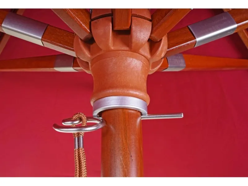 Der Schirm muss sich leicht entfalten lassen. KEINE Gewalt oder Kraft anwenden. Auch wenn die Streben des Schirmes extrem verstärkt sind, besteht – wie bei allen Schirmen – die Gefahr, dass die Holzstreben sich verkeilt haben. In diesem Fall bitte vor dem Öffnen unter den Stoff greifen und die Holzstreben wieder korrekt anordnen. Im Anschluss lässt sich der Schirm leicht entfalten.