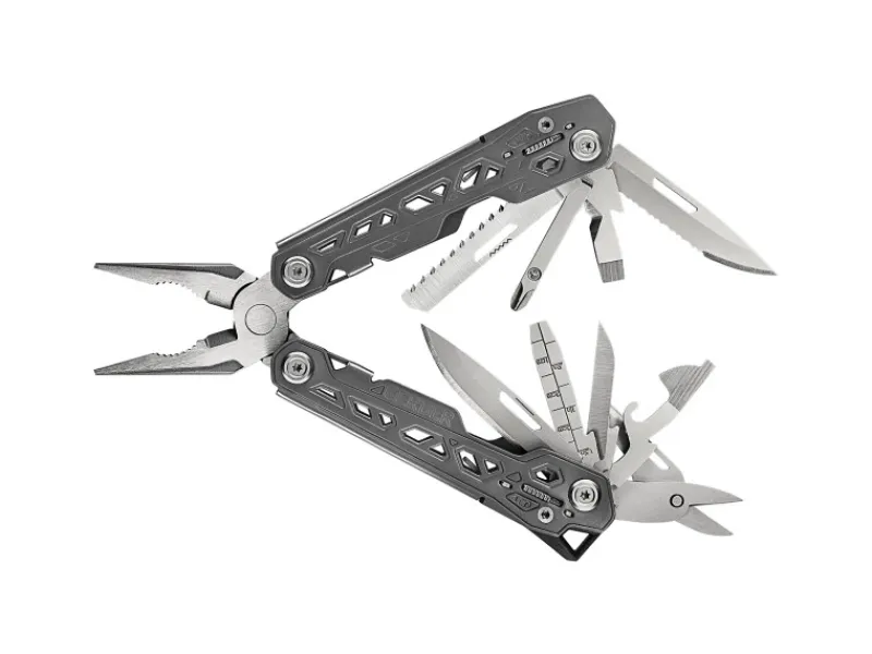Solides Klappmesser mit 17 Werkzeugen u. a.: 5,7 cm lange Klinge mit Teilwellenschliff, kleine Greifzange, Drahtschneider, glatte Klinge, Schere, kleiner/mittlerer/großer Flachschlitzschraubendreher, Kreuzschlitzschraubendreher, Flaschenöffner, Pinzette, Feile