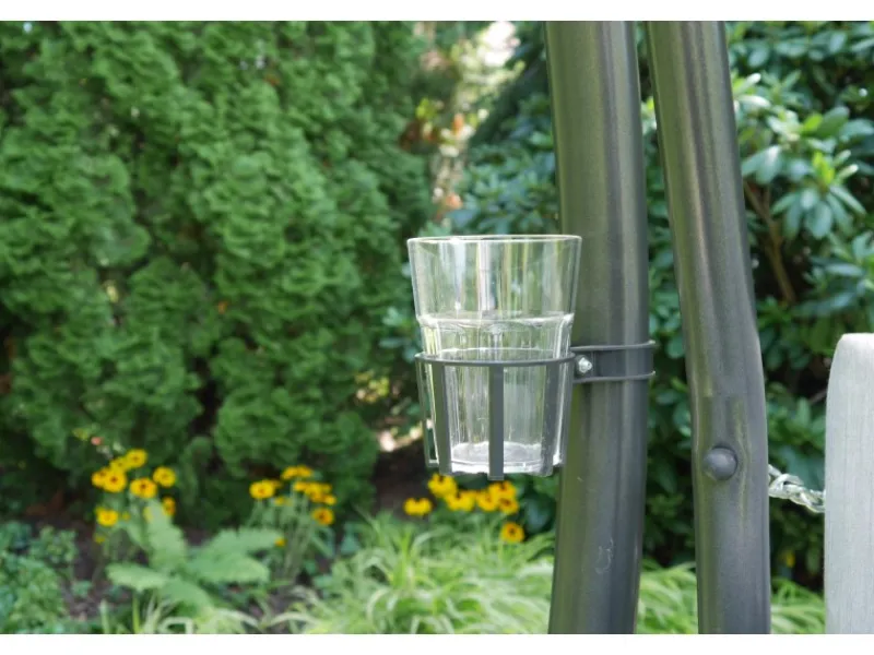 Der Getränkehalter ist das perfekte Accessoire für jede Hollywoodschaukel mit einem Rohrdurchmesser von 50 mm. Er wird einfach durch eine Schelle am Gestell befestigt und hält stets ein kühles Getränk für Sie parat. Ein passender Becher ist im Lieferumfang enthalten. Made in Germany.
