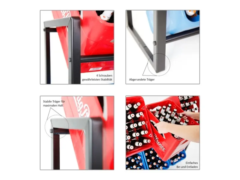 Die Streben lassen sich mit 4 Schrauben ganz einfach am Rahmen montieren. Sie brauchen sich keine Gedanken über den richtigen Winkel zum aus-und einräumen machen. Dies haben wir bereits für Sie getan und den perfekten Winkel für Sie herstellen lassen. Natürlich lassen sich nicht nur Getränkekisten in dem Regal lagern, sondern auch eine Vielzahl an anderen möglichen Kisten, wie bspw. einem Karton für Leergut.