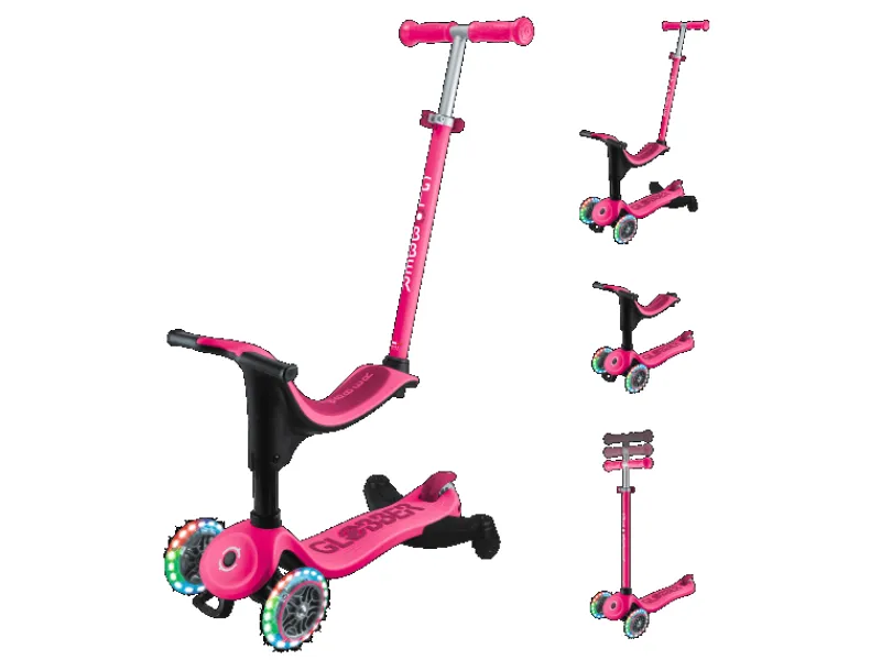 Einfache, werkzeuglose Umbaumöglichkeit zu Aufsitzrad mit Schubstange, Laufrad und Scooter