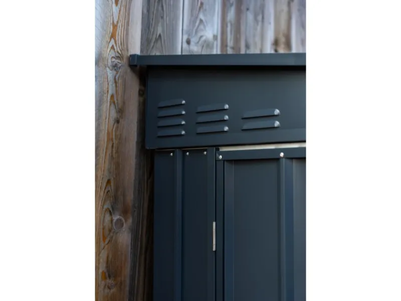 Das Gerätehaus aus Metall überzeugt durch sein ansprechendes Design und ist dabei in der Farbe Anthrazit gehalten.