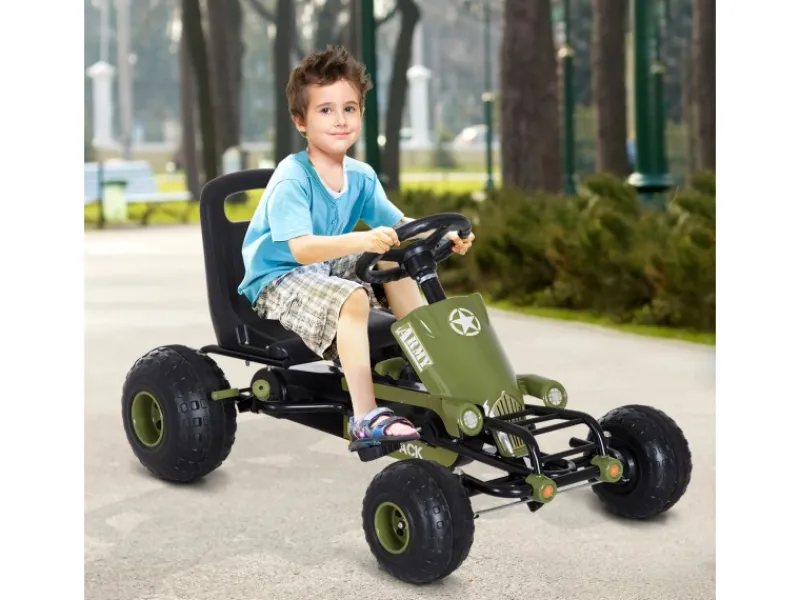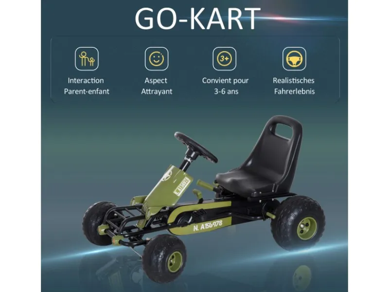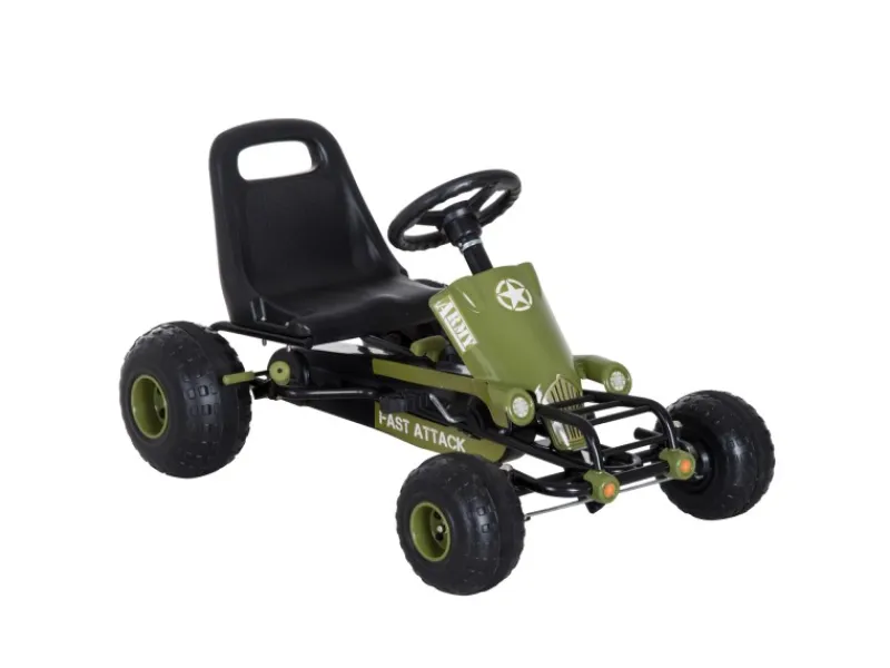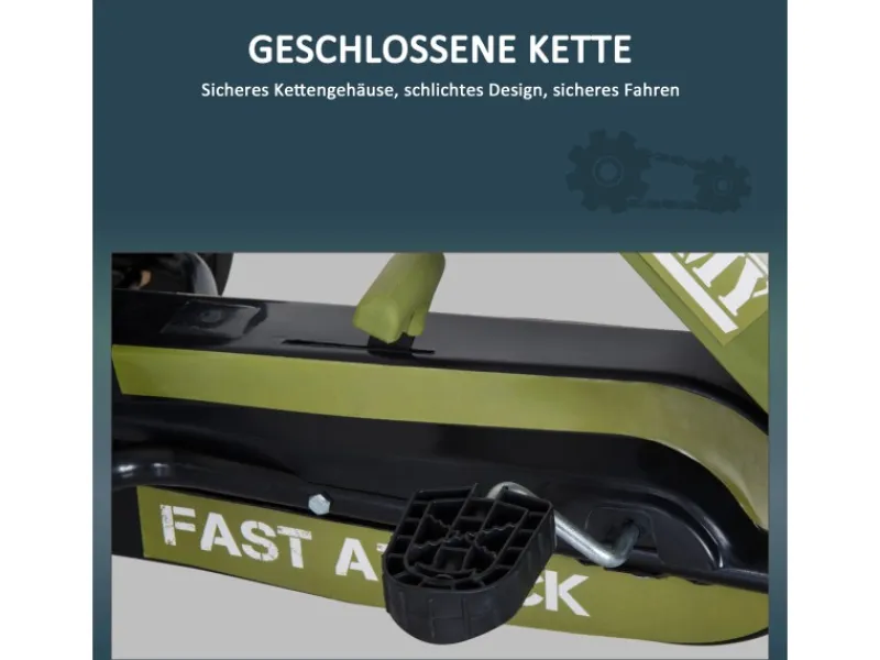Bei unserem Kinder Gokart von HOMCOM wird Fahrspaß großgeschrieben. Das taffe Armee-Design Ihres Kinderfahrzeugs macht Lust auf Draußen, so ist stundenlanger Fahr- und Spielspaß garantiert. Der Kettenantrieb ist gefahrlos unter einem Schutzblech verborgen, gebremst wird mittels Handbremse. So kommt Ihr Kind auch bei voller Fahrt sicher zum Stehen. Er ist flexibel nach vorne oder hinten einstellbar, sodass Ihre Nachwuchsrennfahrer immer bequem sitzen.