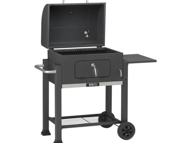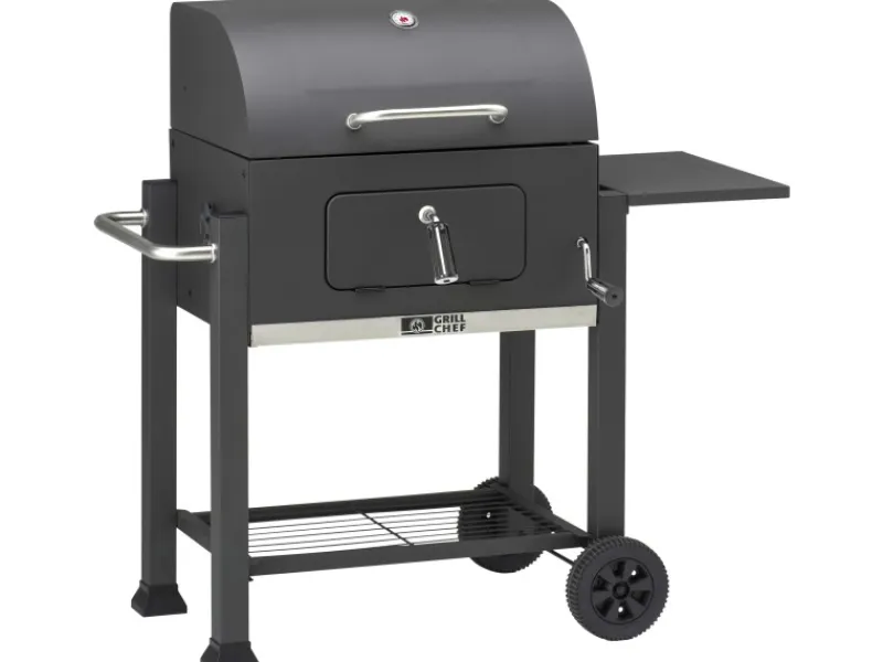 Das Entleeren der Glutreste erfolgt anschließend durch die Ascheschublade. Der emaillierte 2-teilige Grillrost für bis zu 10 Personen, die Feuerraumklappe und der stabile Seitentisch machen diesen Holzkohlegrillwagen zu einem rundum perfekten Grill.