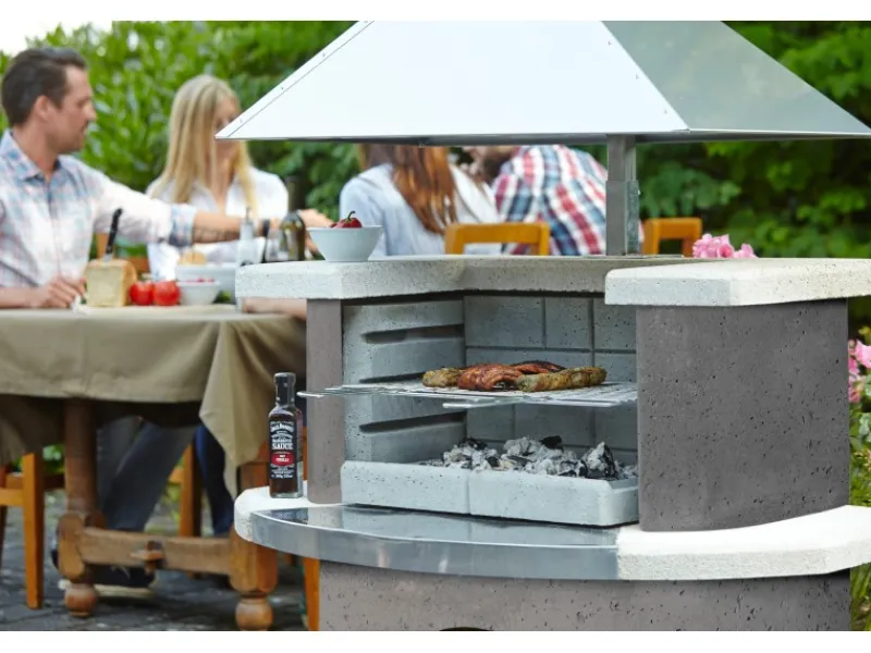 Der Rauchabzug des Grillofens sorgt für einen konstanten Luftzug im Garraum und das Grillgut wird bei gleichmäßiger Hitze gegrillt. Das Besondere an dieser Abzugshaube ist, dass sie höhenverstellbar ist und somit ein freies Arbeiten vor dem Grillkamin ermöglicht. Die doppelwandige Bauweise hält dabei auch hohen Temperaturen stand. Zudem sind der Grillrost und die Glut von oben geschützt, sodass das Grillen und Feuermachen auch bei Regen und Wind möglich ist. Der Schornstein verhindert weiterhin einen Asche- oder Funkenflug, sodass Ihre Gäste von einem raucharmen Betrieb profitieren. Aufgrund der Bauweise kann die Befeuerung des Garten-Kaminofens sowohl mit Holz als auch mit Holzkohle erfolgen. So schaffen Sie entweder eine stimmungsvolle Atmosphäre und Wärmequelle an kühlen Abenden oder bereiten Ihr Grillgut auf den Punkt genau zu.