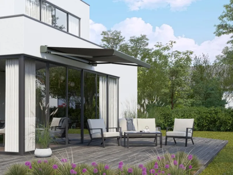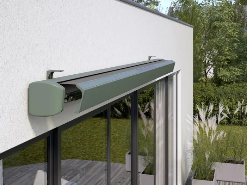 Solarbetriebener Sonnenschutz für Terrasse oder Balkon im modernen Design mit Halbkassette
