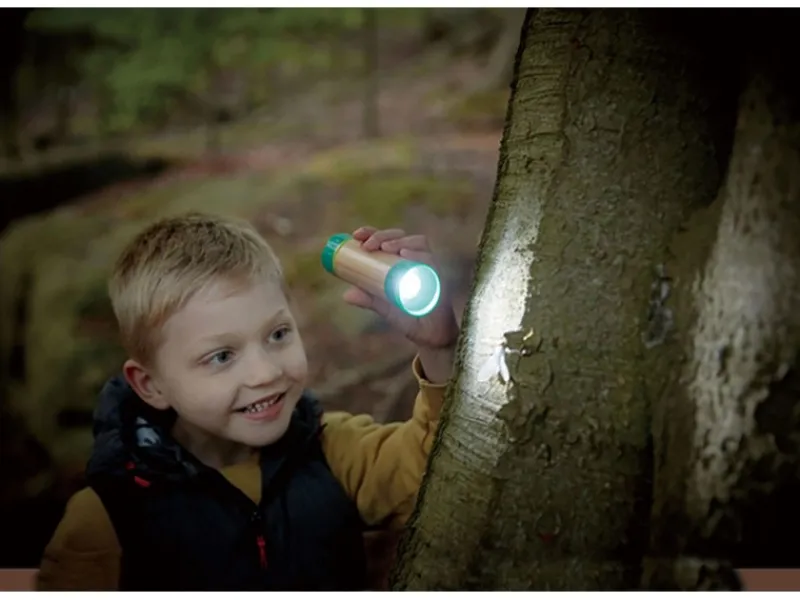 Mit dieser nachhaltigen Hape Hand-Taschenlampe erzeugen kleine Entdecker aus eigener Kraft Licht im Dunkeln. Hergestellt ist sie aus Bambus und Biomasse-Kunststoff.