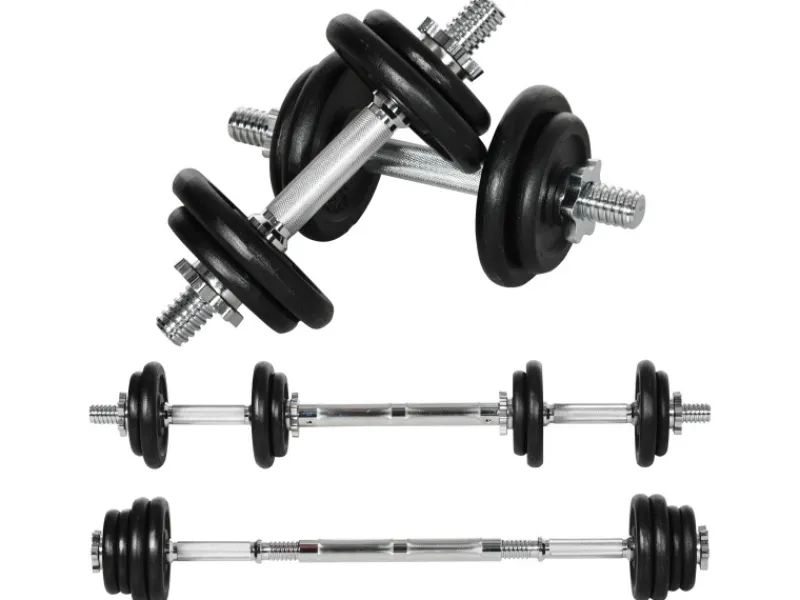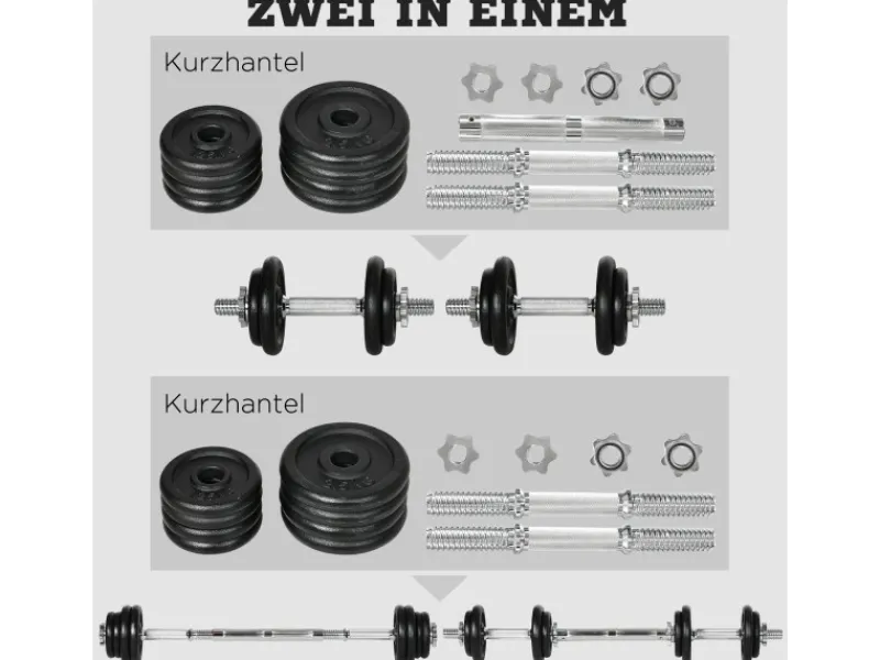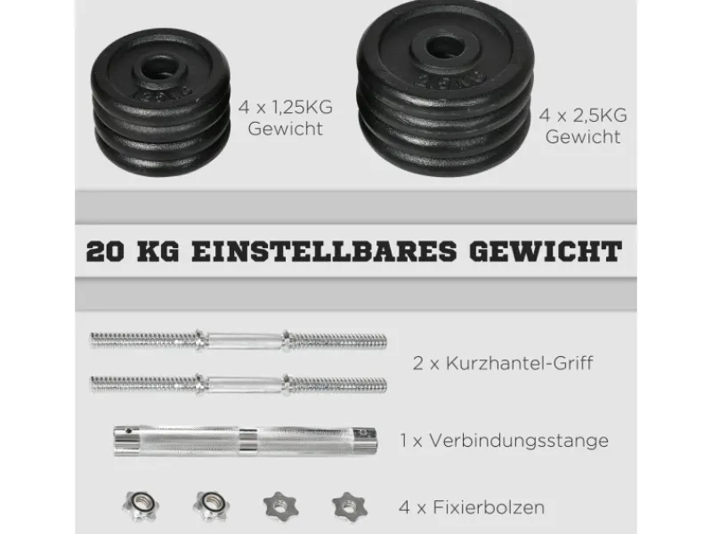 ● Zwei Kurzhanteln kombinierbar zu einer Langhantel, insgesamt 20 kg Gewicht