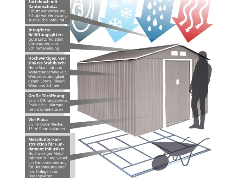 Der Schuppen ist aus lackiertem und verzinktem Stahlblech gefertigt und in einem zeitlosen Design gehalten. Der mitgelieferte Fundament-Rahmen aus Metall bietet Stabilität und einen sicheren Stand – Sie haben hier die Möglichkeit einen Boden einzuziehen (Bodenplatten nicht im Lieferumfang enthalten).
