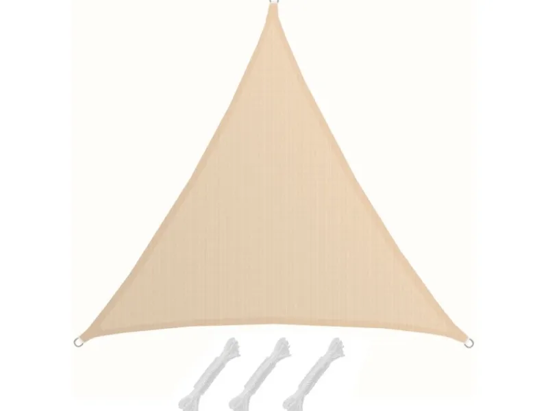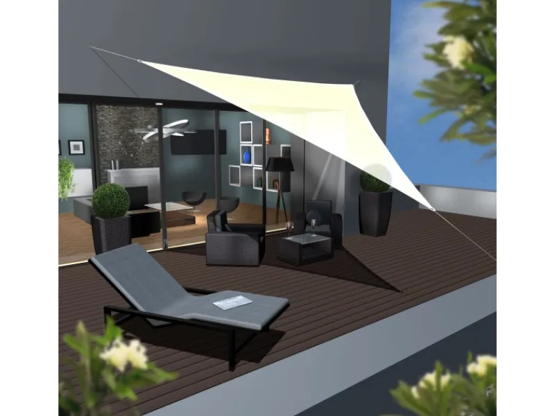 Sonnensegel mit eingenähtem Gurt, D-Ringen aus Edelstahl und 3 robusten PE Seilen.