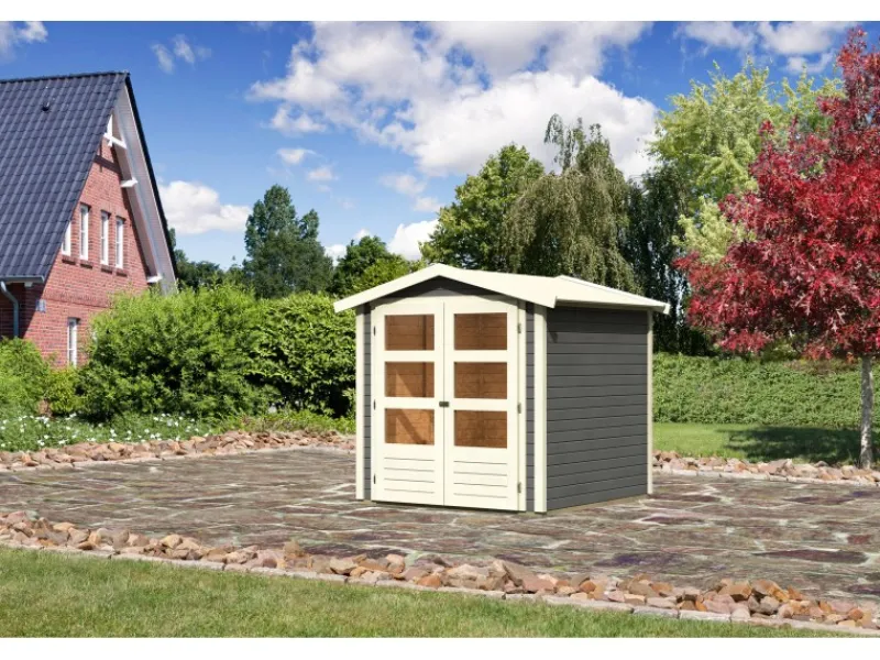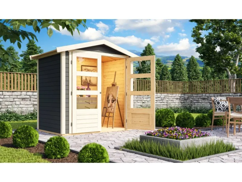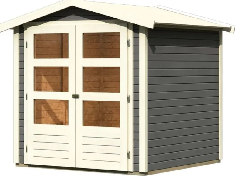 Das Gartenhaus aus Holz überzeugt durch sein modernes Design und ist dabei in schlichtem Terragrau gehalten. Es eignet sich zum Verweilen, als Gartenpavillon, Geräteschuppen oder Freizeithaus.