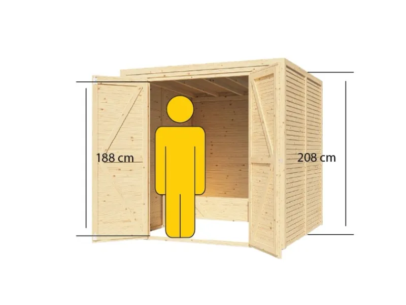 Das Bertilo Holz-Gartenhaus der Box-Serie mit feinem Rhombusprofil in 18 mm Stärke ist ein echtes Raumwunder dank über 2 Meter hohen Seitenwänden. Die 188 cm hohe Doppeltür ermöglicht die Unterbringung auch großer Gartengeräte. Diese hat ein leichter Aufbau dank exakt vorgefertigter Elemente.