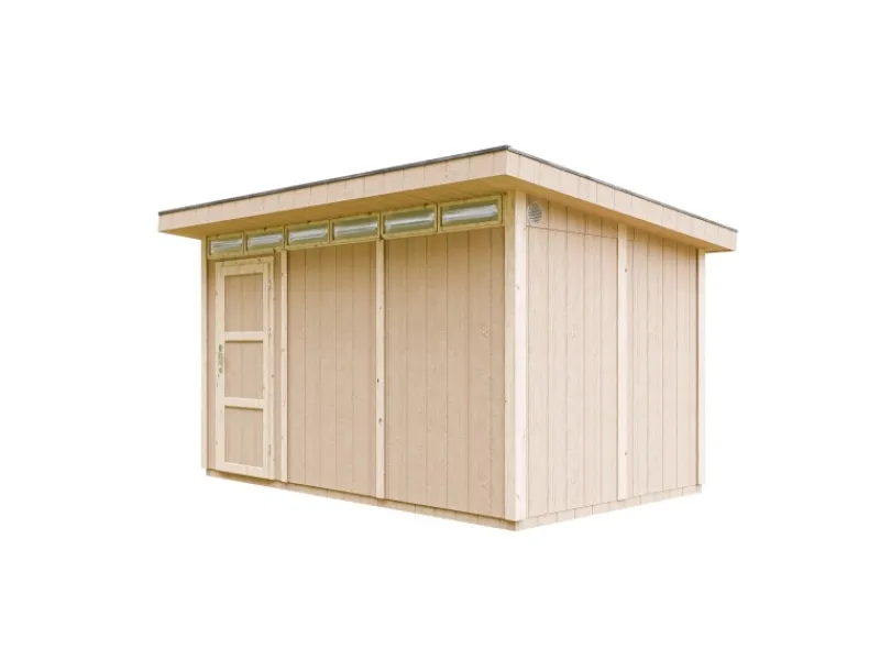 Das Gartenhaus ist in Blockbohlenbauweise aus Holz gefertigt. Das Gartenhaus verfügt über eine stabile Konstruktion, mit einer Wandstärke von 10 mm. Die maximalen Schneelast des Flachdachs liegt bei 127 kg/m. Aufgrund der speziellen Dachform eignen sich hochwertige Dachbahnen besonders gut als Dacheindeckung.