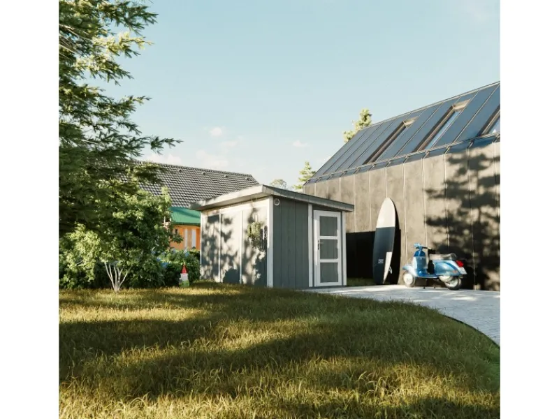 Das Holz-Gartenhaus überzeugt durch sein modernes Design. Es eignet sich besonders zur Aufbewahrung von Gegenständen.