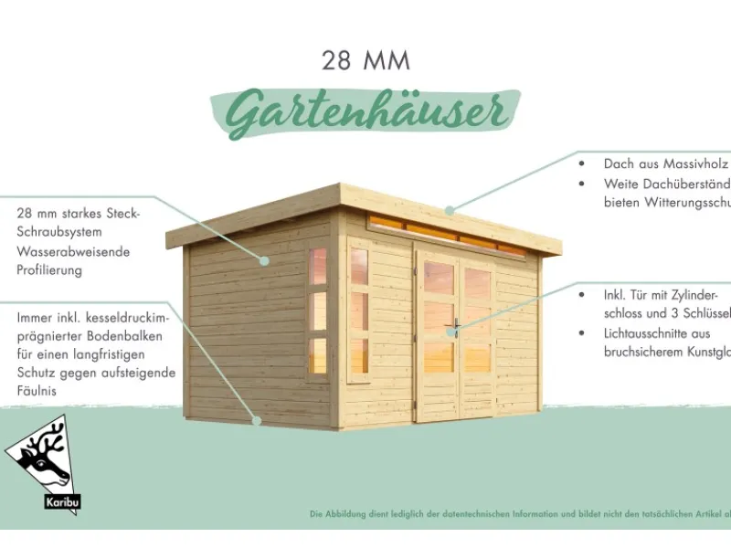 Das Gartenhaus ist aus unbehandeltem Holz im Steck- & Schraubsystem gefertigt. Durch die naturbelassene Oberfläche bleibt eine natürliche Optik mit Holzmaserung erhalten. Zum Schutz vor Witterungseinflüssen sollte die Oberfläche individuell mit einer Lackierung oder Lasierung veredelt werden. Für die Montage der Gartenlaube müssen Sie kein Profi-Handwerker sein. Dank des praktischen Steck-Schraubsystems kann die Montage problemlos durchgeführt werden und die einzelnen Teile lassen sich einfach verbinden. Das Haus verfügt über eine stabile Konstruktion, mit einer Wandstärke von 28 mm. Die maximalen Schneelast des Satteldachs liegt bei 85 kg/m. Die Dacheindeckung ist separat erhältlich.