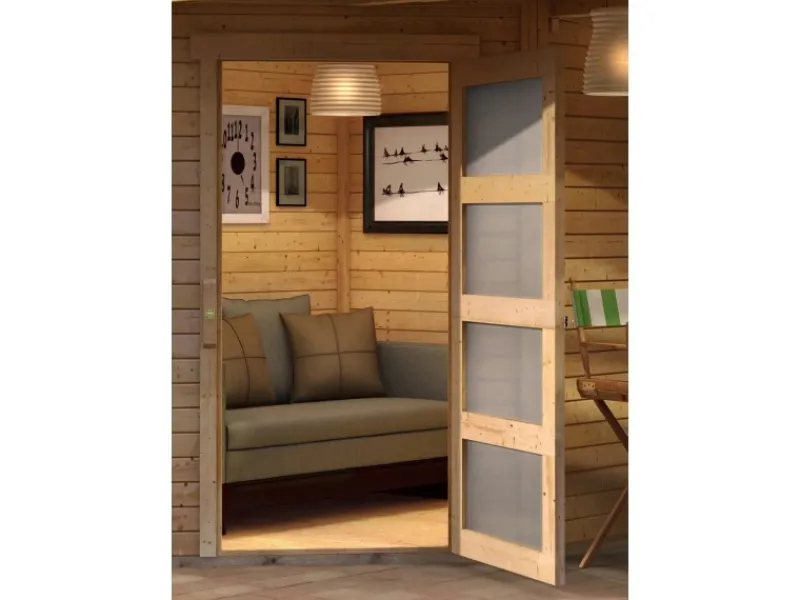 Das Gartenhaus ist aus unbehandeltem Holz im Steck- & Schraubsystem gefertigt. Durch die naturbelassene Oberfläche bleibt eine natürliche Optik mit Holzmaserung erhalten. Zum Schutz vor Witterungseinflüssen sollte die Oberfläche individuell mit einer Lackierung oder Lasierung veredelt werden. Für die Montage der Gartenlaube müssen Sie kein Profi-Handwerker sein. Dank des praktischen Steck-Schraubsystems kann die Montage problemlos durchgeführt werden und die einzelnen Teile lassen sich einfach verbinden. Das Gerätehaus verfügt über eine stabile Konstruktion, mit einer Wandstärke von 19 mm. Die maximalen Schneelast des — liegt bei 75 kg/m. Die Dacheindeckung ist separat erhältlich.