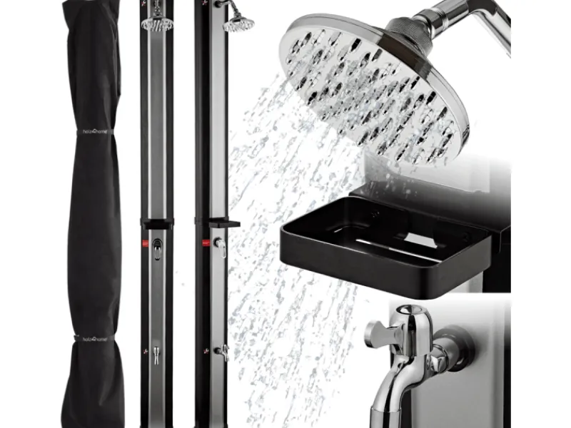 Vielseitig und Funktional Unsere Solardusche bietet Ihnen eine perfekte Lösung für erfrischende Duschen im Garten oder am Pool. Sie können zwischen einem Volumen von 38 oder 40 Litern wählen, um längere Duschsessions zu genießen. Der schwenkbare Duschkopf ermöglicht eine flexible Ausrichtung, während der integrierte Temperaturregler Ihnen erlaubt, die Wassertemperatur nach Ihren Wünschen einzustellen. Zusätzlich sorgen die praktische Seifenablage und die integrierte Fußdusche für zusätzlichen Komfort und Bequemlichkeit beim Duschen im Freien. Einfache Montage Die Montage unserer Solardusche ist dank der praktischen Snap-In Funktion und des mitgelieferten Bodenelements kinderleicht. Im Lieferumfang sind alle notwendigen Schrauben und Dübel enthalten, sodass Sie die Dusche im Handumdrehen sicher installieren können. Egal, ob auf Ihrer Terrasse, im Garten oder am Pool – die Dusche steht stabil und ist sofort einsatzbereit, sodass Sie schnell die Vorzüge genießen können. Robuste Materialien und UV-Beständigkeit Gefertigt aus hochwertigem, UV-beständigem Kunststoff, hält die Solardusche auch intensiver Sonneneinstrahlung problemlos stand. Die verchromten Apparaturen verleihen der Dusche nicht nur eine ansprechende Optik, sondern sorgen auch für Langlebigkeit und Zuverlässigkeit. Diese robuste Konstruktion stellt sicher, dass die Dusche viele Sommer überdauert und Ihnen stets ein erfrischendes Duscherlebnis bietet. Wetterfeste Schutzhülle Zum Schutz Ihrer Solardusche vor Regen, Schmutz und anderen Witterungseinflüssen wird eine wetterfeste Schutzhülle mitgeliefert. Diese Hülle ermöglicht ein problemloses Überwintern der Dusche, ohne dass ein kompletter Abbau erforderlich ist. Nach der Reinigung und Entleerung der Dusche können Sie sie einfach in das Schutzcover hüllen, um sie optimal zu schützen. Alternativ lässt sich die Dusche auch leicht demontieren, falls Sie dies bevorzugen.