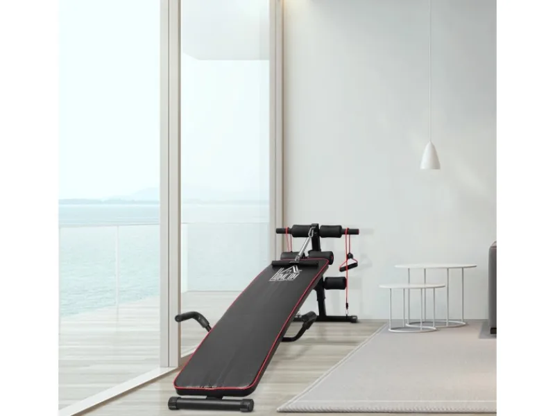 Unsere hochwertige Sit-Up-Bank von HOMCOM bietet Ihnen die optimale Alternative zum Fitnessstudio. Mit Ihrer Trainingsbank können Sie Ihren ganzen Körper ganz bequem zu Hause trainieren und Ihre Muskeln aufbauen. Ihr Profi-Trainer ist aus robustem Stahl gefertigt, äußerst stabil und dank des kompakten Designs platzsparend lagerbar. Dank der Trainingsbänder und dem Ruderzusatz können Sie außerdem gezielt Ihre Armmuskulatur stärken. Bringen Sie sich in Topform – ganz bequem von zu Hause.