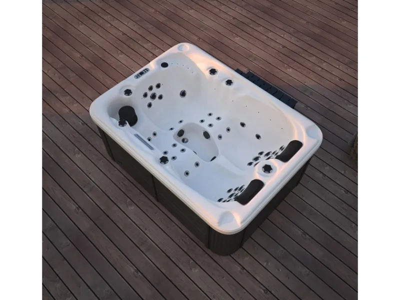 Durch die kompakte Größe von 210 cm x 155 cm x 83 cm passt der Pool in fast jeden Garten. Auch auf Terrassen oder in Wintergärten kann der optisch wie technisch hochwertige Whirlpool platziert werden. 24 Lichtquellen wirken ähnlich einer Farblichttherapie und lassen sich optional zu- bzw. abschalten. Zu der normalen Unterwasserbeleuchtung gesellen sich weitere LEDs am Rand. Sie können nicht nur im Sitzen, sondern auch im Liegen entspannen. Zwei schwarze Kopfstützen sorgen dabei für eine bequeme Kopfposition. Durch das eingebaute Display am Rande des Whirlpools lassen sich verschiedene Funktionen regeln. Die Zirkulationspumpe kann manuell auf 2 verschiedene Geschwindigkeiten gestellt werden. Zusätzlich erhalten Sie ein passendes Filterset.