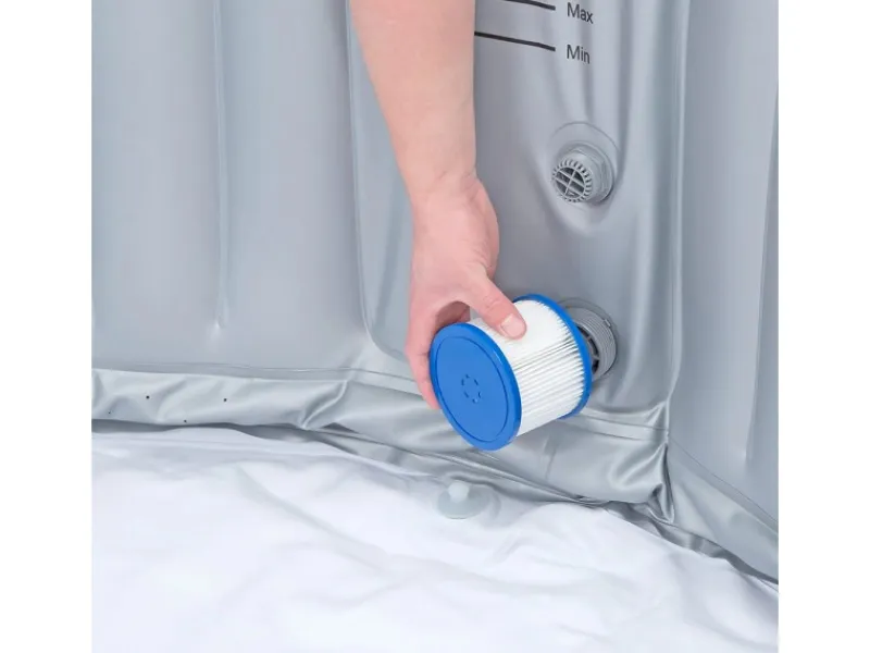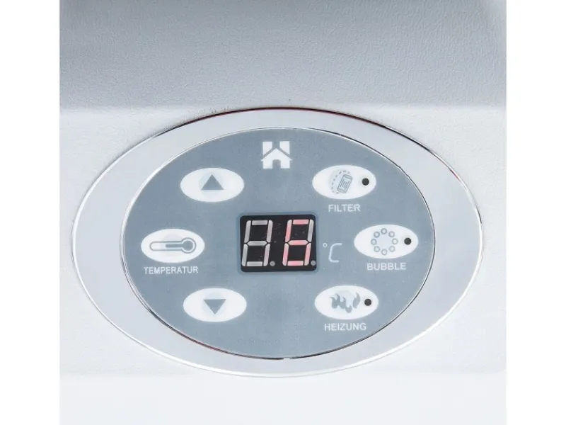 Über das digitale Bedienfeld können Sie die Massagedüsen, das Filtersystem und die Heizung ganz unkompliziert steuern. Der Aufbau geht schnell und unkompliziert und lässt sich von nur einer Person ausführen. Nach dem Ausbreiten bläst sich der Pool mit Hilfe der integrierten Pumpe automatisch auf.