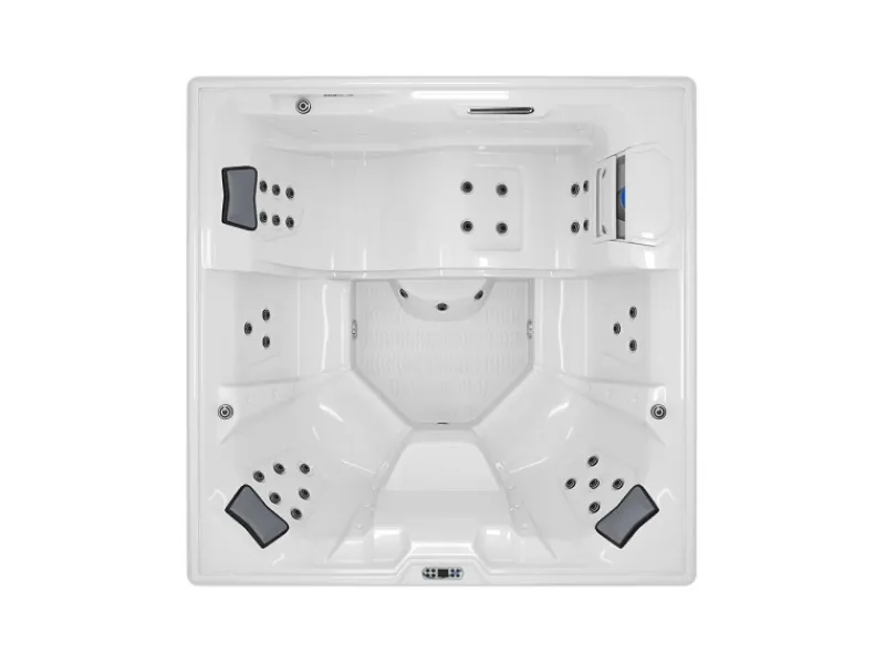 Der Whirlpool bietet verschiedene Sitz- und Liegepositionen. Insgesamt 34 Massagedüsen sorgen für eine blubbernde Massage um die Muskeln zu entspannen oder Stress abzubauen. Zusätzlich bieten 33 LED-Lichter im Boden und in den Innenwänden eine relaxende Lichttherapie. Drei schwarze Kopfstützen sorgen dabei für noch mehr Komfort.