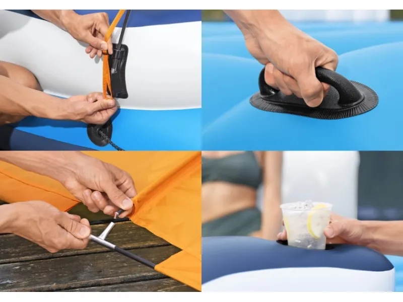 Sechs integrierte Getränkehalter und Halteleinen an beiden Enden bieten maximalen Bedienkomfort. Die schwimmende Einstiegshilfe erleichtert Dir den Einstieg ins kühle Nass, und die Schnellverschlussventile ermöglichen ein zügiges Aufpumpen und Ablassen der Luft, damit der Badespaß schnell beginnen kann.