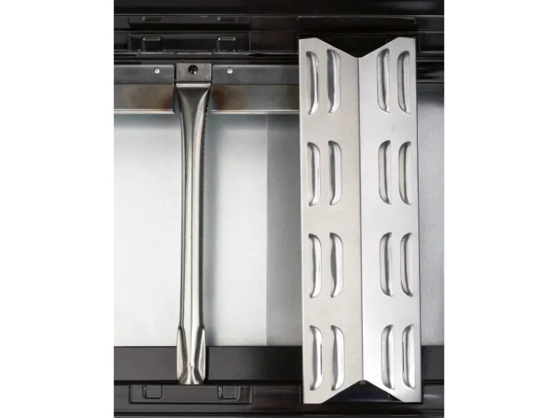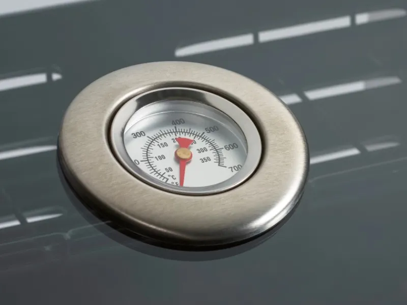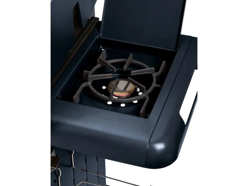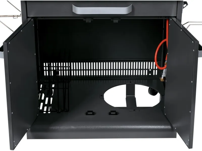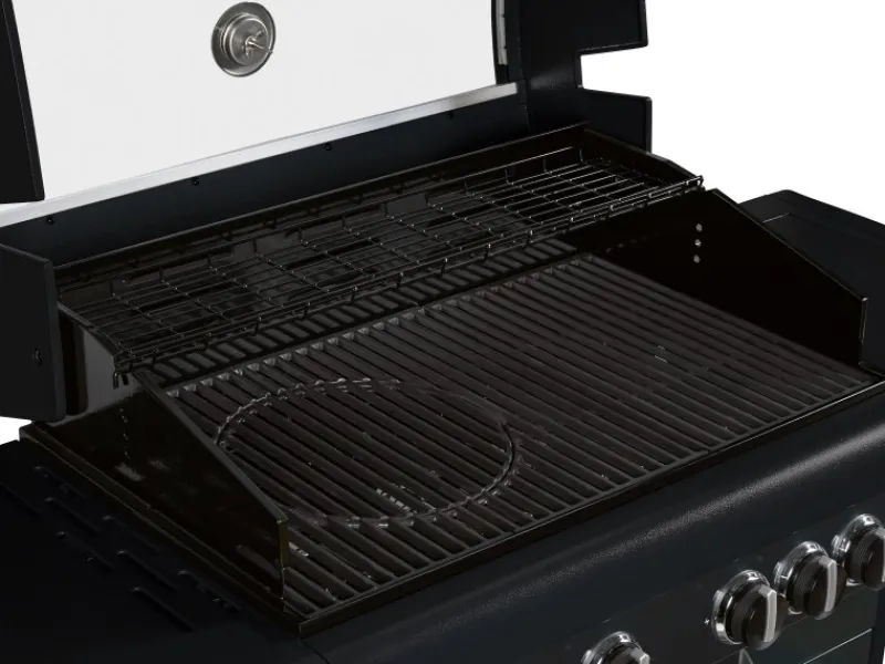 Der Grillrost aus hochwertigem Gusseisen bietet eine Gesamtgrillfläche von 80 cm x 50 cm inklusive eines Warmhalterostes. Das im Deckel integrierte Thermometer hilft dir dabei, die individuelle Temperatur für das Grillgut zu wählen. Weiterhin ermöglicht der emaillierte Deckel durch sein Fenster beste Sicht auf deine Steaks auch beim indirekten Grillen mit geschlossenem Deckel. Auf dem praktischen Seitengrill kannst du zusätzliche Speisen in einer Pfanne oder einem Topf zubereiten.