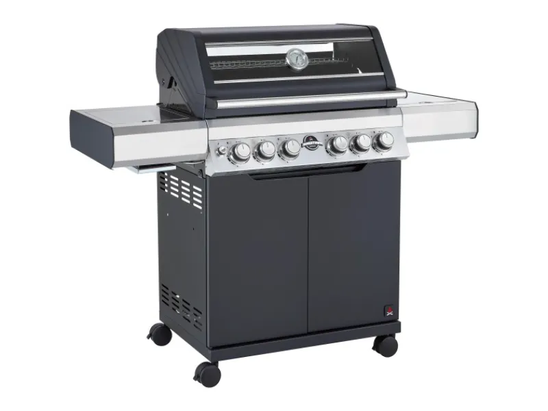 Die hochwertigen Edelstahlbrenner lassen sich Piezo-Zündung schnell entzünden und erreichen insgesamt eine Leistung von 20,5 kW. Die Brenner kannst du getrennt voneinander regulieren, sodass du auch nur eine Seite der Grillfläche mit direkter Hitze versorgst. Bei geschlossenem Deckel kannst du dann auch indirekt grillen. Die 6 beleuchteten Bedienknöpfe sind nicht nur ein absoluter Blickfang, sondern zeigen dir auch an, welche Brenner entzündet sind. Das Deckelthermometer zeigt dir die Hitze im Garraum an. Durch den Glaseinsatz im Deckel kannst du jederzeit nach deinem Fleisch schauen, ohne den Deckel öffnen zu müssen. So nimmst du keine Temperaturverluste in Kauf.