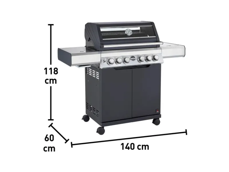 Für ein leichtes Verschieben ist der Grill mit Rollen ausgestattet. Dazu besitzt er einen geräumigen Unterschrank, in dem sich Gasflaschen bis zu 11 kg aufbewahren lassen. Beide Seitenbrenner kannst du bei Nichtgebrauch abdecken und als praktische Ablagefläche nutzen.