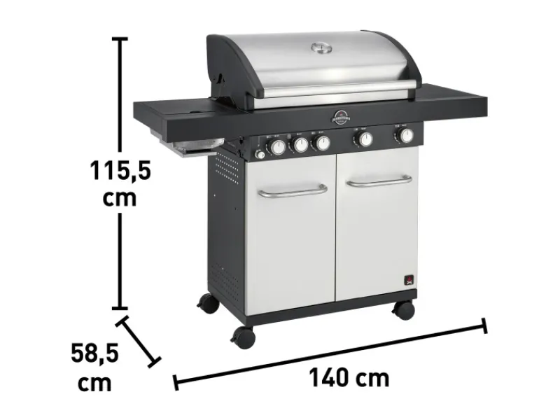 Dank seiner Rollen lässt sich der Grill mühelos an die gewünschte Grillstelle transportieren. In seinem geräumigen Unterschrank bietet er Aufbewahrungsmöglichkeiten für Gasflaschen bis zu 11 kg. Dazu ist der Grillwagen mit einem klappbaren Seitentisch versehen, auf dem du Grillzubehör griffbereit ablegen kannst.