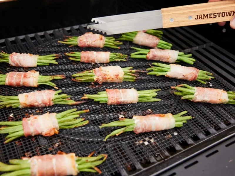 Die praktischen Antihaft-Grillmatten von Jamestown ermöglichen das schonende Garen von Fleisch, Fisch oder Gemüse auf dem Gartengrill oder im Backofen. Gleichzeitig schützen sie deinen Grillrost vor Verschmutzungen und sind mit einer Temperaturbeständigkeit bis 260 °C gleichermaßen für Holzkohle-, Gas- oder Elektrogrills geeignet. Bei Bedarf kannst du sie auch mit der Schere auf das gewünschte Maß bringen. Die Matten aus Glasfaser besitzen eine hochwertige PTFE-Antihaft-Beschichtung. Das Material zeichnet sich durch seine optimale Hitzeleitung aus und verhindert gleichzeitig, dass Steaks oder Maiskolben auf der Oberfläche haften bleiben. Du kannst die aufrollbaren Backmatten beidseitig nutzen und wiederverwenden. Nach Gebrauch sind sie ganz einfach mit heißem Wasser und etwas Geschirrspülmittel zu reinigen. Die Größe einer Matte beträgt 42 cm x 36 cm (L x B) und kann bei Bedarf auch mit einer Schere auf das gewünschte Format gekürzt werden.