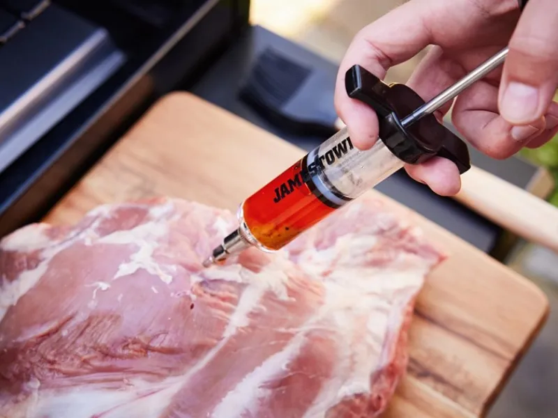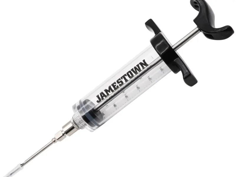 Die JAMESTOWN Marinierspritze ist aus stabilem Kunststoff gefertigt und optimal geeignet für die Injektion von Marinaden direkt ins Grillgut. Damit reduzieren sich die Marinierzeiten und du kannst ein noch intensiveres Aroma erzielen. Das Fassungsvermögen der Spritze beträgt 30 ml und mit der aufgedruckten Skala lässt sich das Einspritzen der Marinade exakt dosieren. Für eine unkomplizierte Reinigung, lässt sich die Edelstahl-Kanüle ganz einfach vom Spritzenkörper trennen.