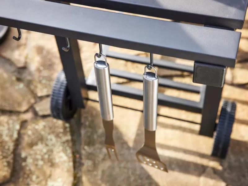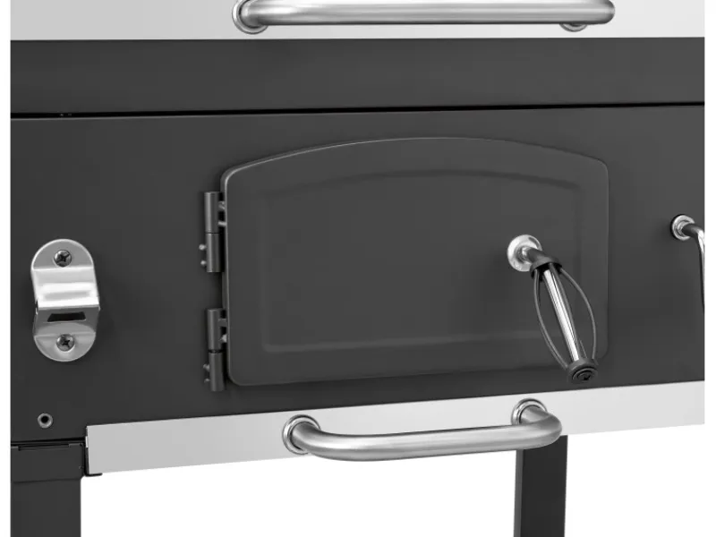 Mit seinen beiden großen Seitenablagen sowie der Gestellablage bietet dir der XL-Holzkohlegrill viele Möglichkeiten, deine Grillutensilien abzulegen. So hast du alles, was du brauchst immer in erreichbarer Nähe. Damit du deinen Grillwagen platzsparend verstauen kannst, lassen sich die Seitenablagen einklappen. Außerdem ist er mit zwei leichtgängigen Rädern ausgestattet, wodurch er sich leicht zum Einsatzort schieben lässt. Ein besonderes Highlight für die Grillparty ist der seitlich angebrachte Flaschenöffner. Schließlich darf ein kühles Getränk nicht fehlen! Die praktische Ascheschublade unterstützt dich optimal bei der Reinigung des Jaxon XL.