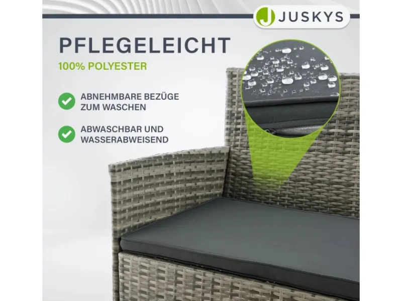Polyrattan ist ideal für Outdoor, da das Geflecht wetterfest, strapazierfähig und langlebig ist. Die hohe Elastizität ermöglicht ein angenehmes Sitzen auch ohne Kissen. Es trotzt Hitze, UV-Strahlung und Regen. Bei Schmutz lässt sich die Sitzgarnitur leicht mit einem feuchten Tuch reinigen.