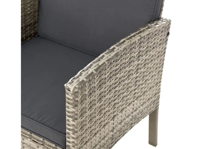 Das stylishe Loungemöbel besteht aus Polyrattan, das nicht nur langlebig ist, sondern auch pflegeleicht und wetterfest. Also ideal für draußen im Garten geeignet.