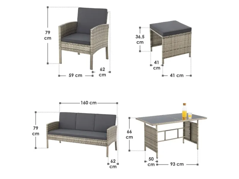 – Belastbarkeit: 480 kg Bank; 160 kg je Stuhl & Hocker