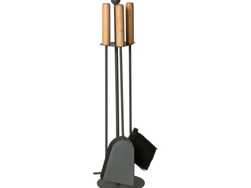 Das Kaminbesteck in schlichtem und dennoch edlem Design passt gut zu fast jeder Wohnzimmereinrichtung. Sowohl das Besteck selbst als auch die Halterung bestehen aus anthrazit beschichtetem Metall. Besen, Schaufel und Schürhaken verfügen über Holzgriffe, die das elegante Design des Kaminbestecks abrunden.