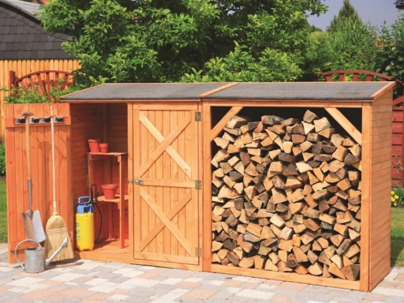 Diese Kaminholzkombination bietet einen eleganten Geräteschrank mit integriertem Kaminholzanbau aus massivem Kiefernholz, wetterfest imprägniert. Das Dach ist mit Dachpappe gedeckt. Im Innenraum befindet sich ein praktisches Regal. Die Materialstärke beträgt 1,6 cm. Kaminholzkombination mit Doppelschrank Gesamtmaß: B 295 cm x T 78 cm x H 163 cm Maße des Kaminholzanbaus: B143 cm x T78 cm x H163 cm