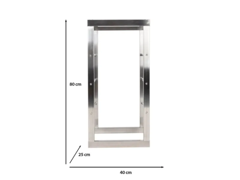 Kaminholzregal Chios – Feuer und Flamme für ein stylisches DesignDer kalten Jahreszeit entfliehen und es sich zuhause bei Tee oder heißer Schokolade vor dem Kamin gemütlich machen. Wind und Wetter einfach sein lassen – der nächste Abend mit Familie oder Freunden kann kommen. Was hierbei noch fehlt? Mit unserem Kaminholzregal in modernem Design ist nicht nur eine praktische, sondern dekorative Möglichkeit zum Lagern von Brennholz gefunden.Präzise Brennholzaufbewahrung leicht gemachtSie wollen nicht ständig den Weg in den Keller oder zum Baumarkt antreten, um Ihren Vorrat an Brennholz aufzufüllen? Aber ein Muss: Ordnung sowie Glanz in Ihrem Innen- oder Außenbereich. Unser hochwertiges Kaminholzregal bietet das passende Maß an Stauraum. Robustheit, Rost- und Witterungsbeständigkeit trifft auf schlichtes, aber stylisches Design. Im Nu montiert und eine notwendige Ergänzung für Ihre Feuerstelle, die beim nächsten Mal garantiert von allen Besuchern als Highlight bestaunt wird.Zeitlose Zimmerdekoration für Ihren WohnbereichDas Kaminholzregal ist nicht nur der Begleiter für eine spielend leichte Lagerung von Brennholz. Es stellt sich ebenso als die geeignete Lösung für eine Verschönerung Ihres persönlichen Wohlfühlbereichs heraus. Eigentlich heißt es: Reden ist Silber, Schweigen ist Gold. In vorliegendem Falle ist die silberne Beschichtung das Ass im Ärmel, denn sie lässt den Raum ebenso wie das Kaminfeuer erstrahlen.Kaminholzregal Chios – Produkteigenschaften:Material: Eisen + PulverbeschichtungProduktmaße: 40 x 25 x 80 cmAusreichend StauraumStabil und belastbarPlatzsparendRost- und witterungsbeständigFeuerfestEinfache MontageAuch für Außenbereich geeignet