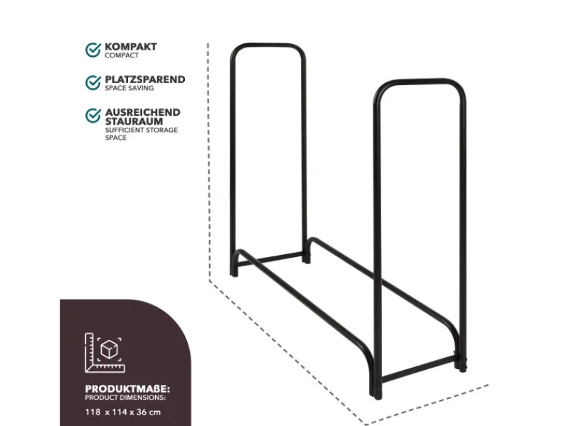 Kaminholzregal „Patmos“ – ein Stück gemütliche Atmosphäre für Ihr Zuhause“Patmos“ – damit verbindet man im ersten Augenblick eine griechische Insel, auf der man ganz entspannt seinen Urlaub genießen kann. Passt also auch ganz hervorragend zu unserem robusten Kaminholzregal, das ebenso diesen Namen trägt. Lehnen Sie sich ganz entspannt zurück und genießen Sie das Feuer im Kamin, denn „Patmos“ erledigt die saubere Lagerung Ihres Brennholzes ohne großen Aufwand.Zeitlose Dekoration für In- und OutdoorMit seinem schlichten, kompakten Design passt dieses Regal perfekt in Ihren In- oder Outdoorbereich. So sind Sie nicht alleine für den nächsten gemütlichen Abend mit ausreichend Brennholz versorgt. Sie haben außerdem eine zeitlos schöne Holzhalterung, die sich dank der Auswahlmöglichkeit zwischen zwei Größen ideal an Ihre Bedürfnisse der Raum- oder Outdoorgestaltung anpasst. Der Clou: „Patmos“ kommt mit einer praktischen Schutzhülle daher, welche ganz einfach mit Klettband befestigt werden kann. Egal ob Wind, Regen, starke Sonneneinstrahlung – das Brennholz bleibt trocken und jederzeit für gemütliche Stunden am Kamin einsatzbereit.Kaminholzregal „Patmos“ – Produkteigenschaften:Material: Eisen + PulverbeschichtungIn 2 verschiedenen Ausführungen/Größen: 36 x 118 x 114 cm, 36 x 232 x 114 cmDurchmesser der Stangen: 2,5 cmDicke des Materials: 1,5 mmAusreichend StauraumStabil und belastbarPlatzsparendRost- und witterungsbeständigFeuerfestEinfache MontageInkl. Polyester-Schutzhülle für gesichertes Brennholz