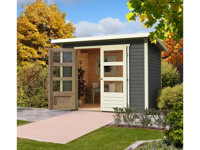 Das robuste und hochwertige Fichtenholz ist in einem schlichten und modernen Grauton lackiert. Die Tür, sowie die Eckpfosten und der Dachrahmen sind in Weiß gehalten und verleihen der Gartenlaube ein nordisches Flair. Die Bodenbalken sind durch eine Kesseldruckimprägnierung vor Witterungseinflüssen und holzzersetzenden Pilzen geschützt.