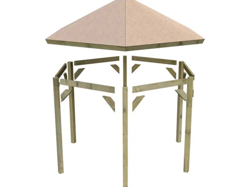 Der sechseckige Pavillon Alicante hat ein Außenmaß von 235 cm x 208 cm und ein Dachstandmaß von 299 cm x 260 cm. Die Seitenhöhe beträgt 199 cm, der First misst 280 cm. Das formschöne Walmdach wird von 6 Pfosten gestützt, die jeweils 9 cm x 9 cm stark sind. Die Pfosten und weiteren Sparren Querverbinder sind kesseldruckimprägniert und somit gegen Witterungseinflüsse bestens geschützt. Wir empfehlen die Verwendung von passenden H-Ankern mit einer Länge von 60 cm für die Befestigung im Untergrund.