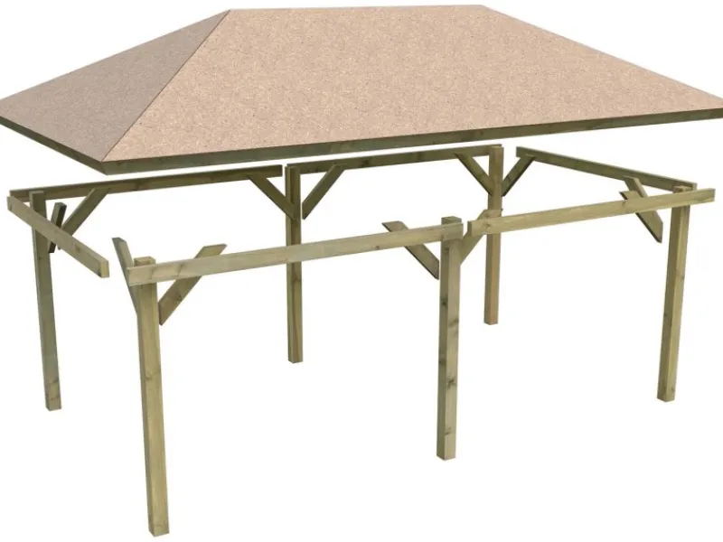 Der Rechtecke Pavillon Bever 4 hat ein Außenmaß von 429 cm x 289 cm und ein Dachstandmaß von 485 cm x 345 cm. Die Seitenhöhe beträgt 210 cm, der First misst 296 cm. Das formschöne Walmdach wird von 6 Pfosten gestützt, die jeweils 9 cm x 9 cm stark sind. Die Pfosten und weiteren Sparren Querverbinder sind kesseldruckimprägniert und somit gegen Witterungseinflüsse bestens geschützt. Wir empfehlen die Verwendung von passenden H-Ankern mit einer Länge von 60 cm für die Befestigung im Untergrund.