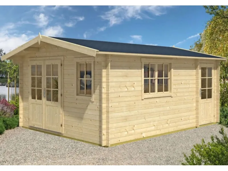 Das Gartenhaus ist in Blockbohlenbauweise aus unbehandeltem Holz gefertigt. Durch die naturbelassene Oberfläche bleibt die Optik der Holzmaserung erhalten. Zum Schutz vor Witterungseinflüssen sollte die Oberfläche individuell mit einer Lackierung oder Lasierung veredelt werden. Das Gerätehaus verfügt über eine robuste Konstruktion, mit einer Wandstärke von 28 mm. Das Dach des Gartenhauses ist als Satteldach konstruiert. Die Dacheindeckung ist separat erhältlich.