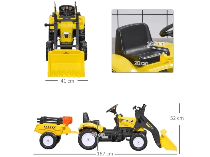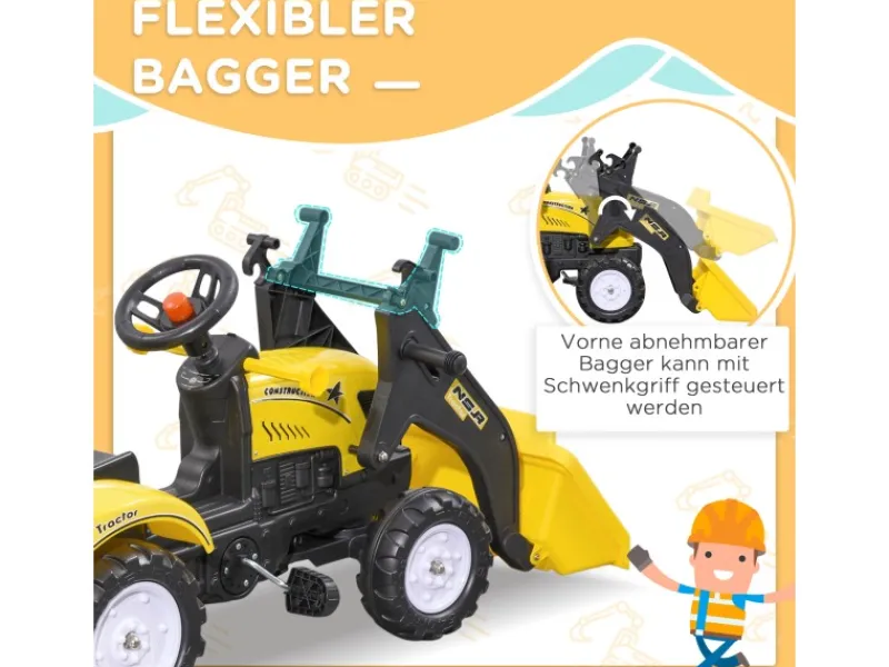 Unser gelb-schwarzer Trettraktor von HOMCOM ist das ultimative Fahrzeug für kleine Baumeister, die sich großen Herausforderungen stellen wollen. Mit seinem Frontlader und der Schaufel können sie spielend Sand, Kiesel und Schutt bewegen. Der Bagger verfügt zudem über einen Anhänger und zwei praktische Werkzeuge, um Baumaterialien und andere Gegenstände zu transportieren. Dank des Pedalantriebs und der sicheren Schutzverkleidung können die kleinen Fahrer unbeschwert spielen und fahren.