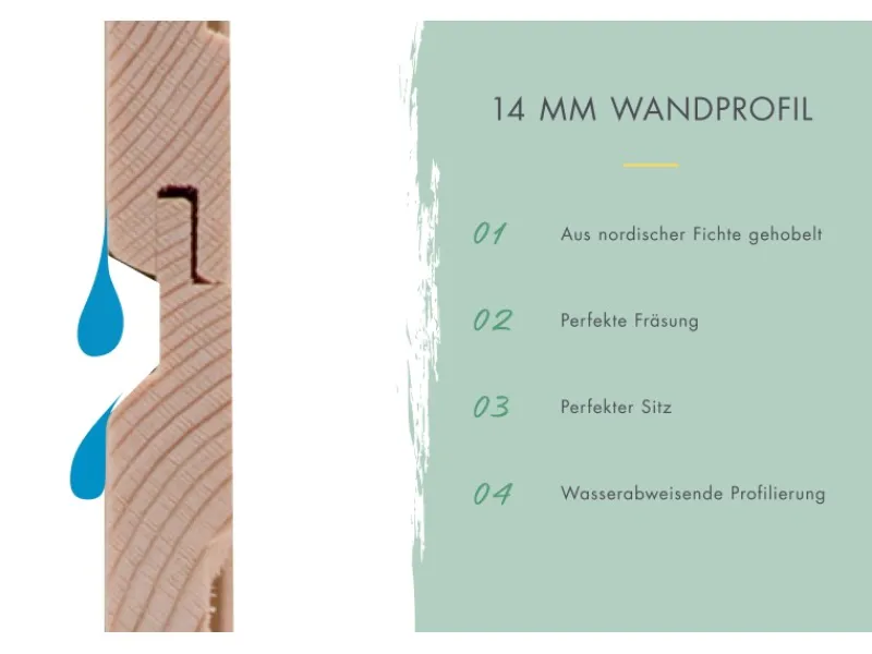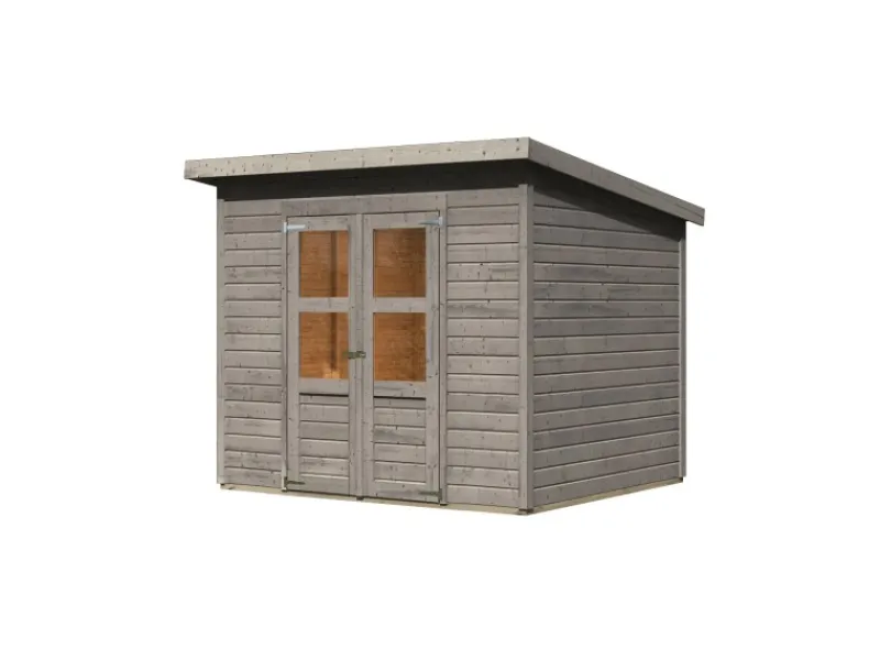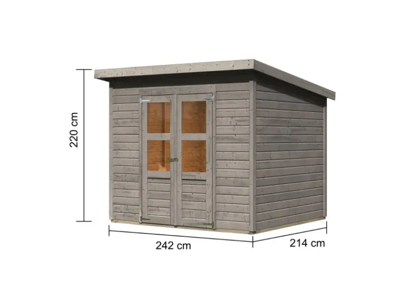 Mit einer Seitenhöhe von 185 cm und einer Firsthöhe von 219 cm bietet das Gerätehaus eine optimale Raumnutzung. Das Gartenhaus ohne Anbauten hat ein Sockelmaß von 238 cm × 210 cm. Bodenbalken sorgen für Schutz von unten und werden unter dem Gartenhaus verlegt.
