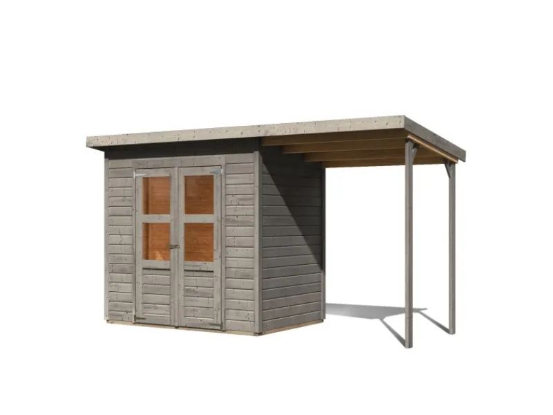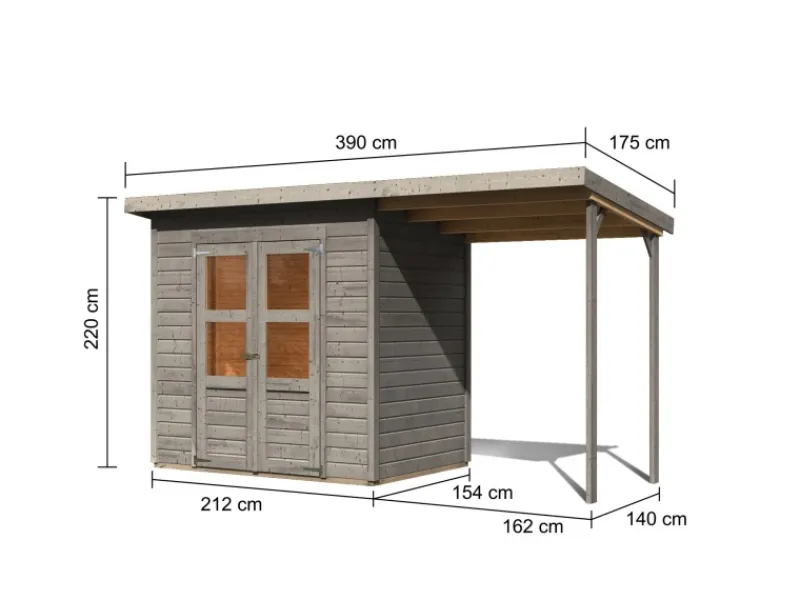 Mit einer Seitenhöhe von 192 cm und einer Firsthöhe von 219 cm bietet das Gerätehaus eine optimale Raumnutzung. Das Gartenhaus ohne Anbauten hat ein Sockelmaß von 208 cm × 150 cm. Bodenbalken sorgen für Schutz von unten und werden unter dem Gartenhaus verlegt. Durch die Kesseldruckimprägnierung der Bodenbalken sind diese bereits vor Witterungseinflüssen und holzzersetzenden Pilzen geschützt.