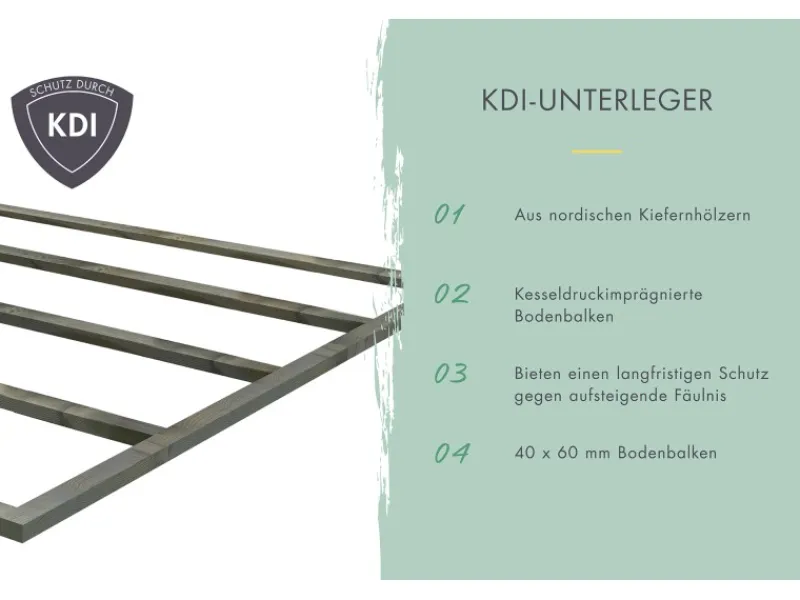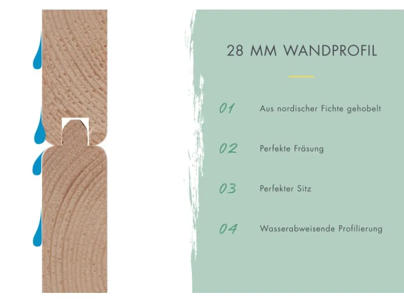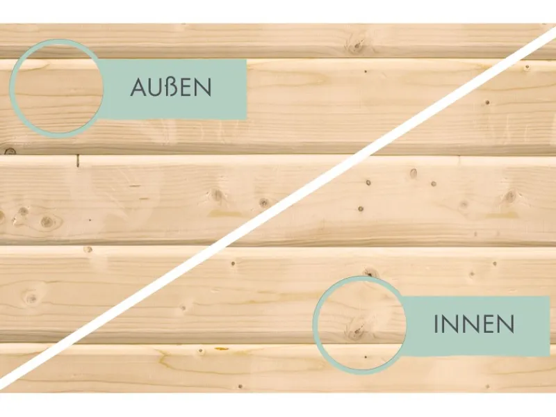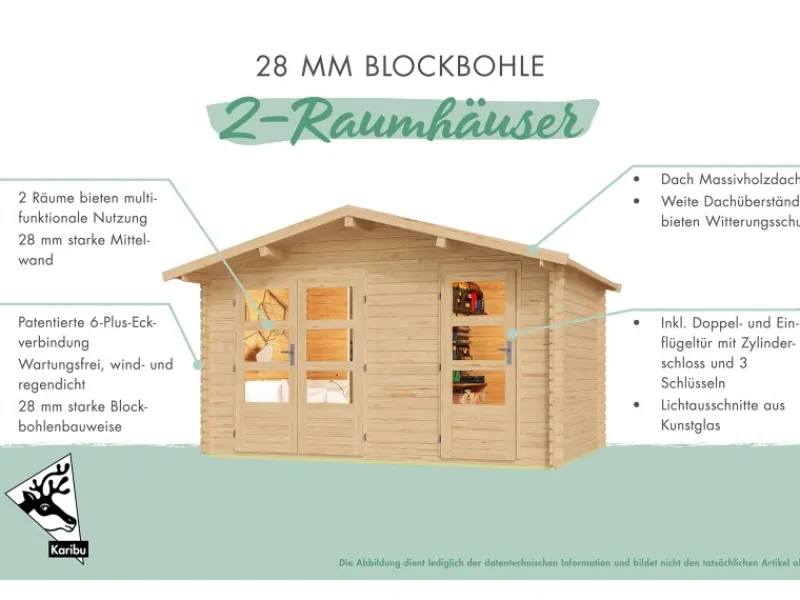 Das Gartenhaus ist in Blockbohlenbauweise aus unbehandeltem Holz gefertigt. Durch die naturbelassene Oberfläche bleibt eine natürliche Optik mit Holzmaserung erhalten. Zum Schutz vor Witterungseinflüssen sollte die Oberfläche individuell mit einer Lackierung oder Lasierung veredelt werden. Das Gartenhaus verfügt über eine robuste Konstruktion, mit einer Wandstärke von 28 mm. Die maximalen Schneelast des Satteldachs liegt bei 85 kg/m. Die Dacheindeckung ist separat erhältlich.