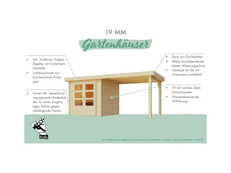 Das Gartenhaus wird aus 19 mm starken Wandbrettern aus nordischer Fichte im Steck-/Schraubsystem gefertigt und gewährleistet somit einen einfachen Aufbau. Das Flachdach besteht aus Dachplatte. Die Grundfläche beträgt 9,03 qm bei einem umbauten Raum von 8,6 cbm. Mit einer Seitenhöhe von 195 cm und einer Firsthöhe von 211 cm bietet das Gerätehaus optimale Raumnutzung. Das Gartenhaus ohne Anbauten hat ein Sockelmaß von 298 cm x 242 cm. Bodenbalken sorgen für den Schutz von unten und werden unter das Gartenhaus gelegt. Durch die Kesseldruckimprägnierung der Bodenbalken sind diese vor Witterungseinflüssen und holzzersetzenden Pilzen bereits geschützt. Die praktische und vormontierte Tür sorgt mit ihren großzügigen Abmessungen und dem Massivholzrahmen für einen einfachen Zutritt in das Gartenhaus und sichert den Inhalt nebenbei effektiv vor unbefugtem Zugriff. Die Verglasung der Lichtausschnitte sorgt für großzügigen Tageslichteinfall.